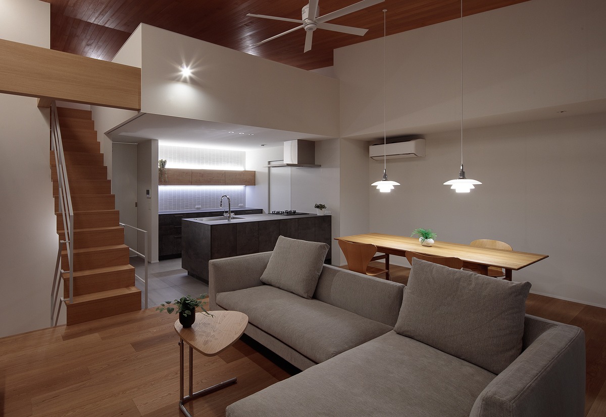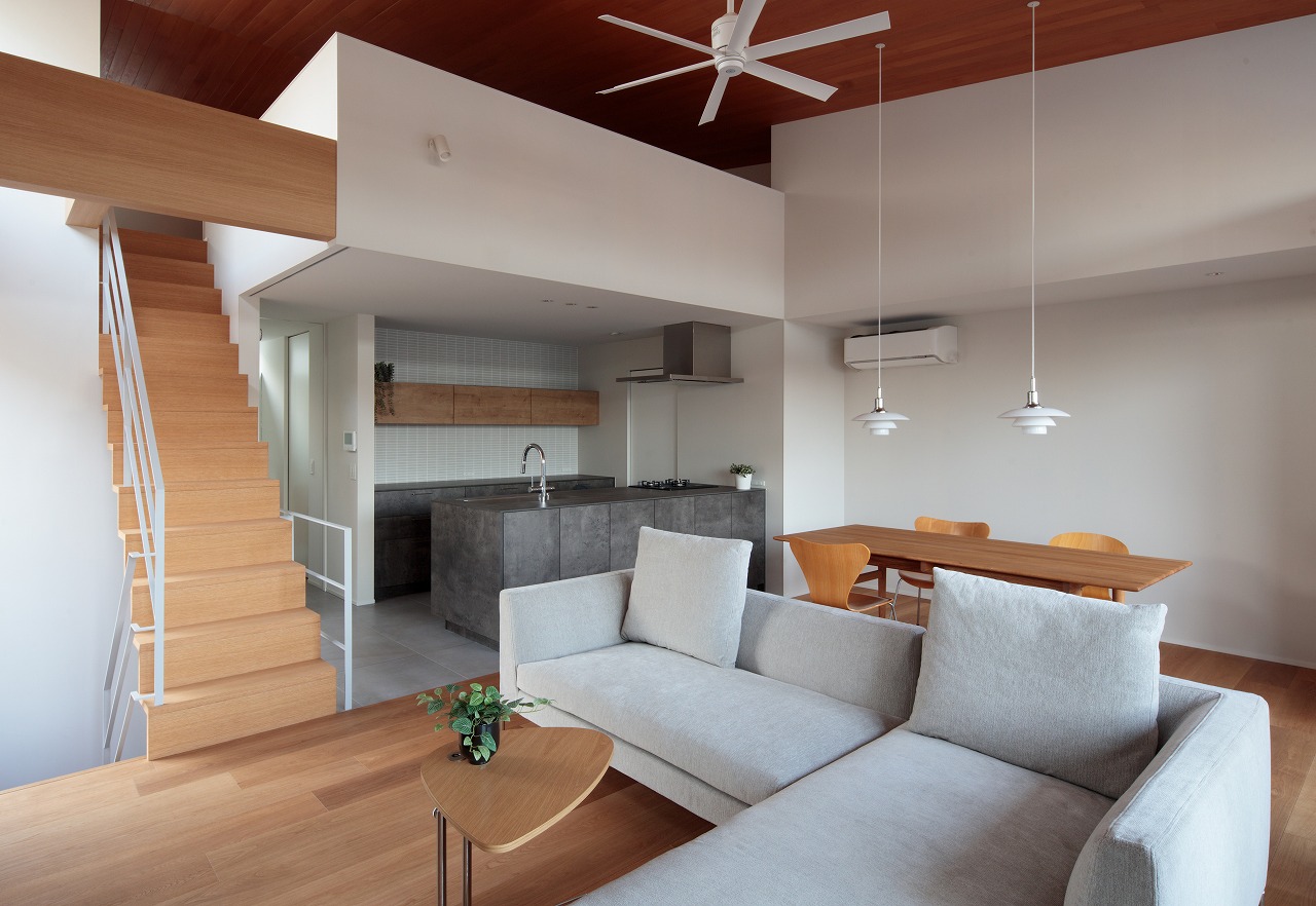 家型のシルエットに屋上テラスを内包した2階建ての住宅です。1階に寝室と水廻り、2階にLDKを配置しており、建主の要望により、冷暖房効率を高めるために1~2階は区画し、各階を独立した構成としています。【デザイン住宅・吹抜・ルーフバルコニー】