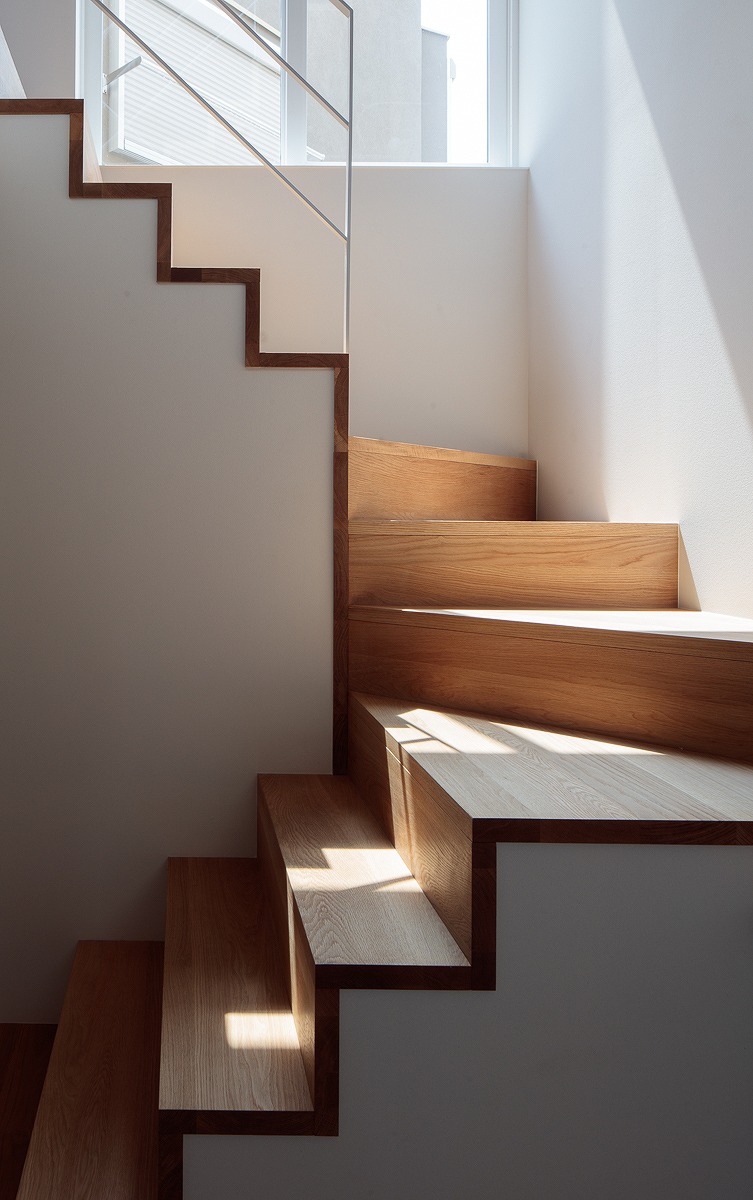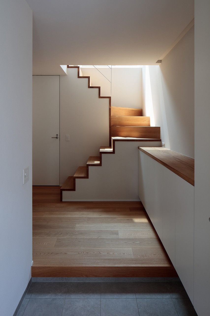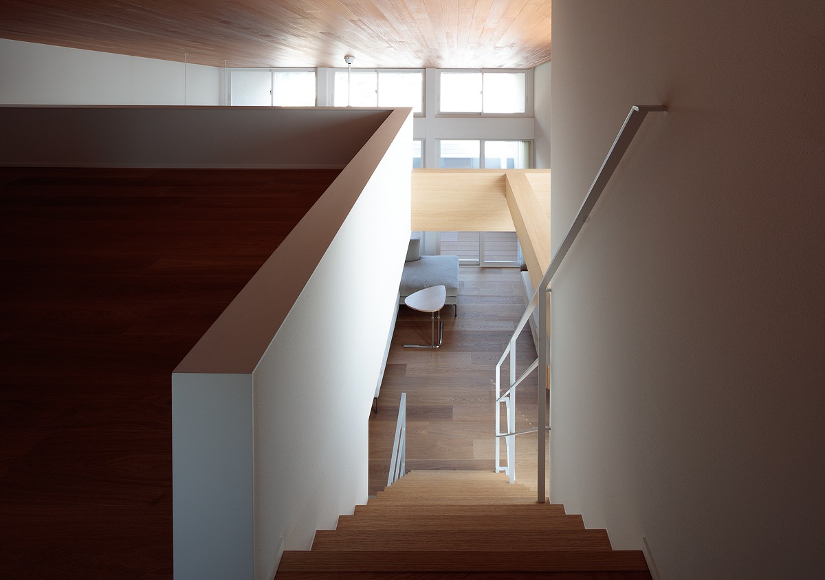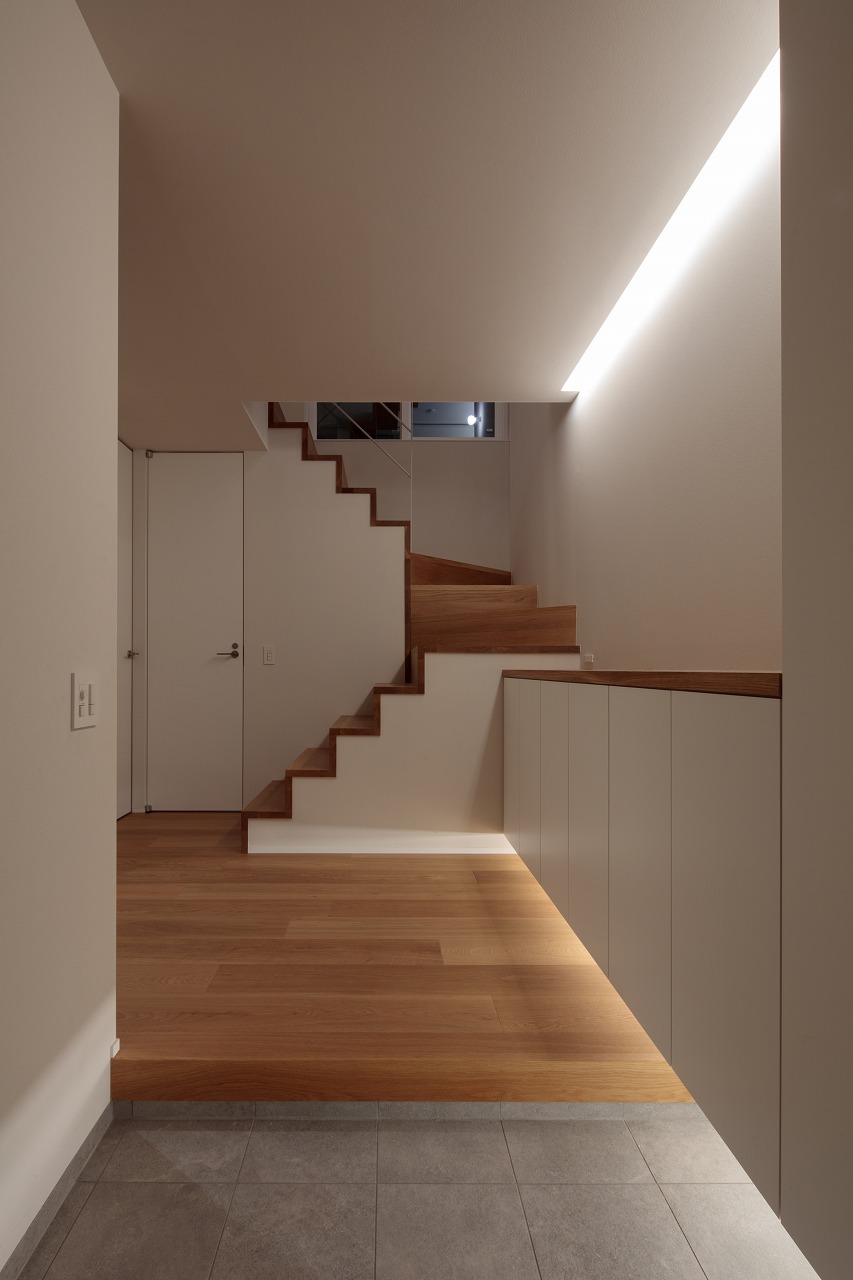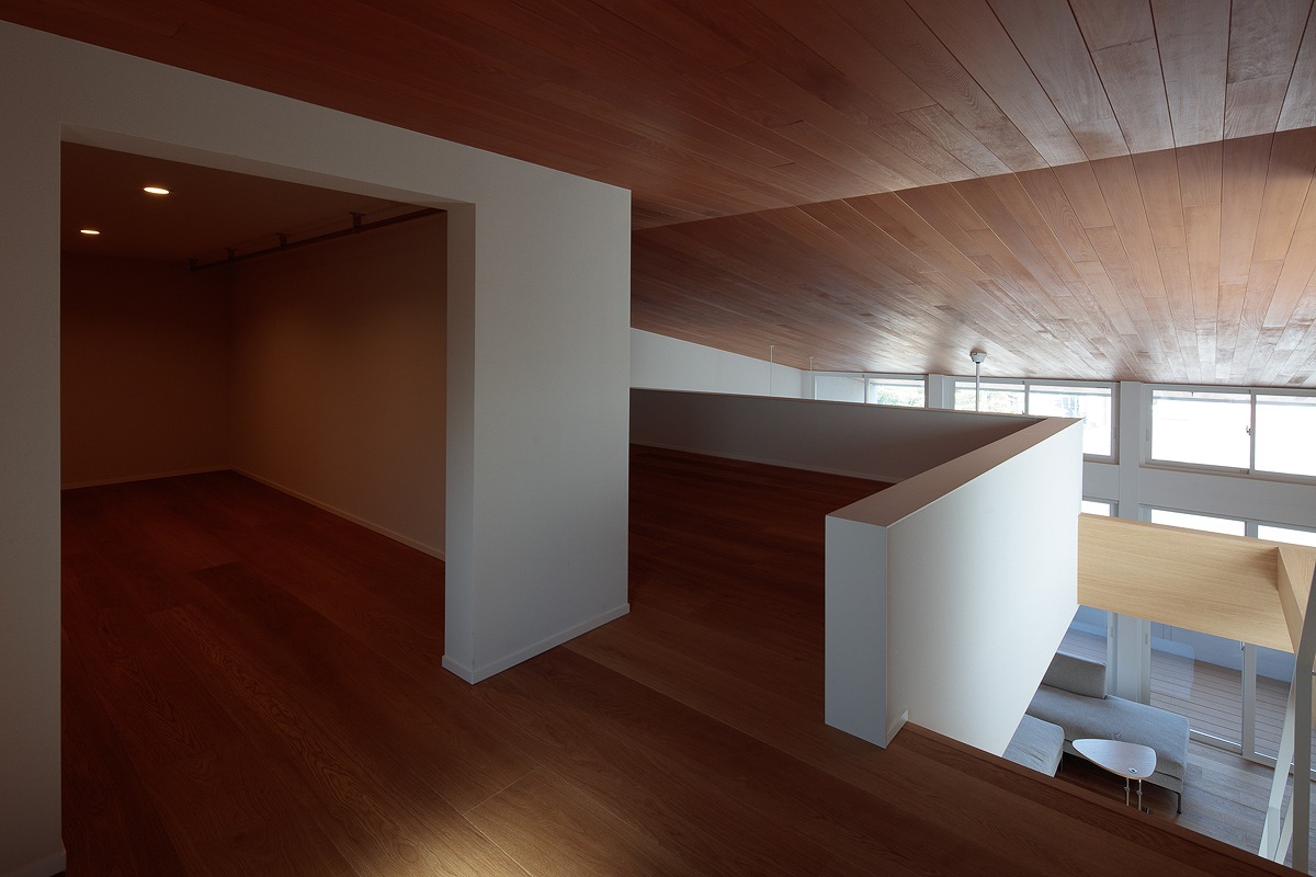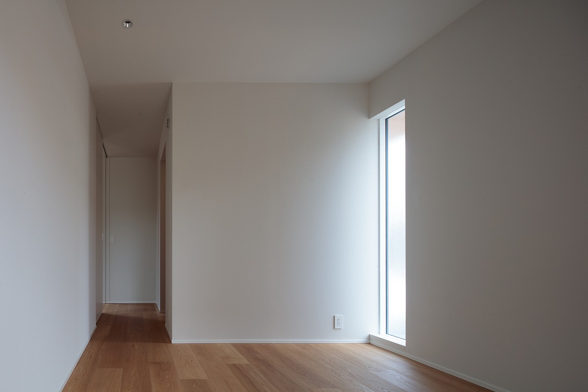1階、2階それぞれにあるハイサイド窓は、各部屋の個別の窓というより、nLDKのプランによる分節された部屋同士を繋ぎ合わせ、この建物全体の窓として機能しています。内部に連続した風景、採光が取り込まれ、一体間が加速されます。【デザイン住宅・二世帯住宅・地下】