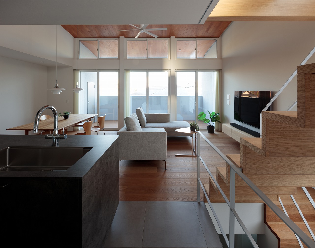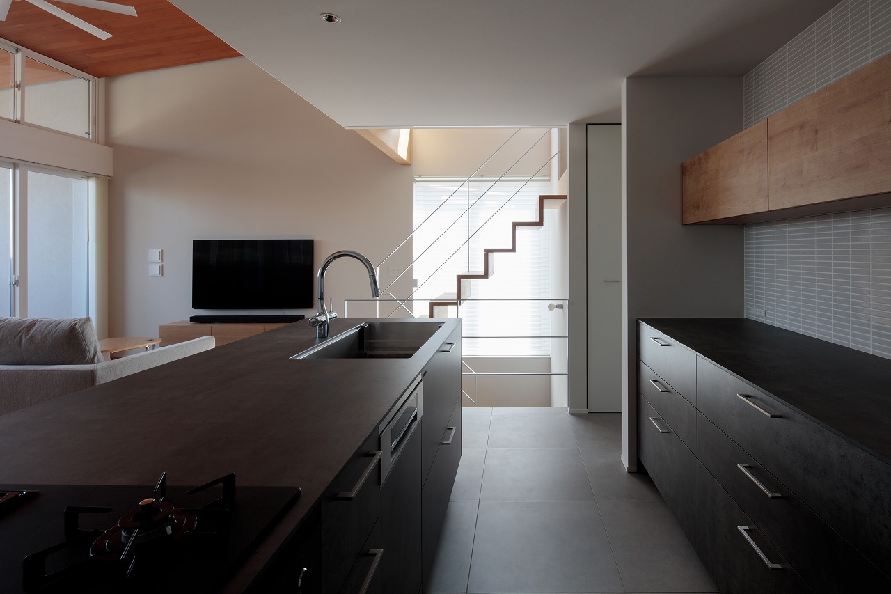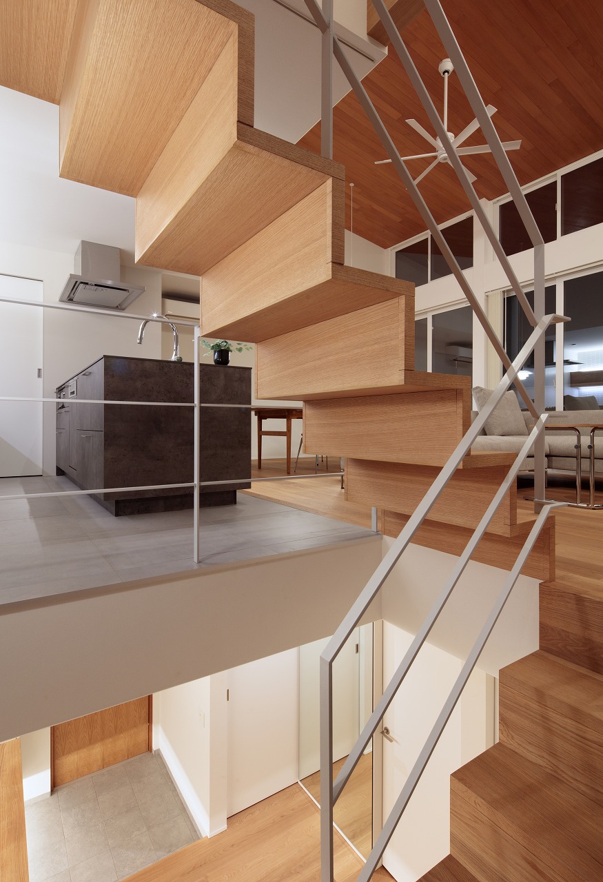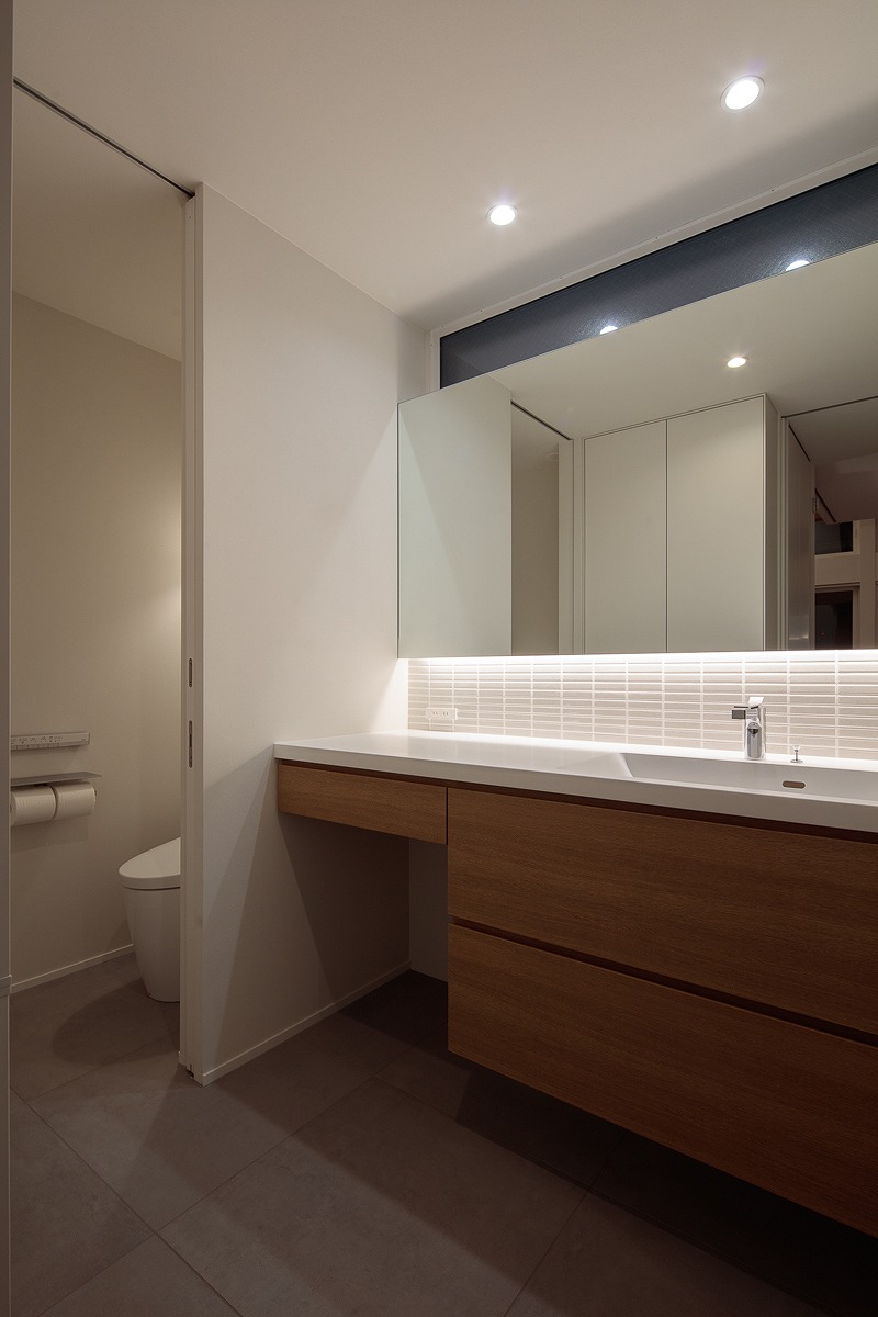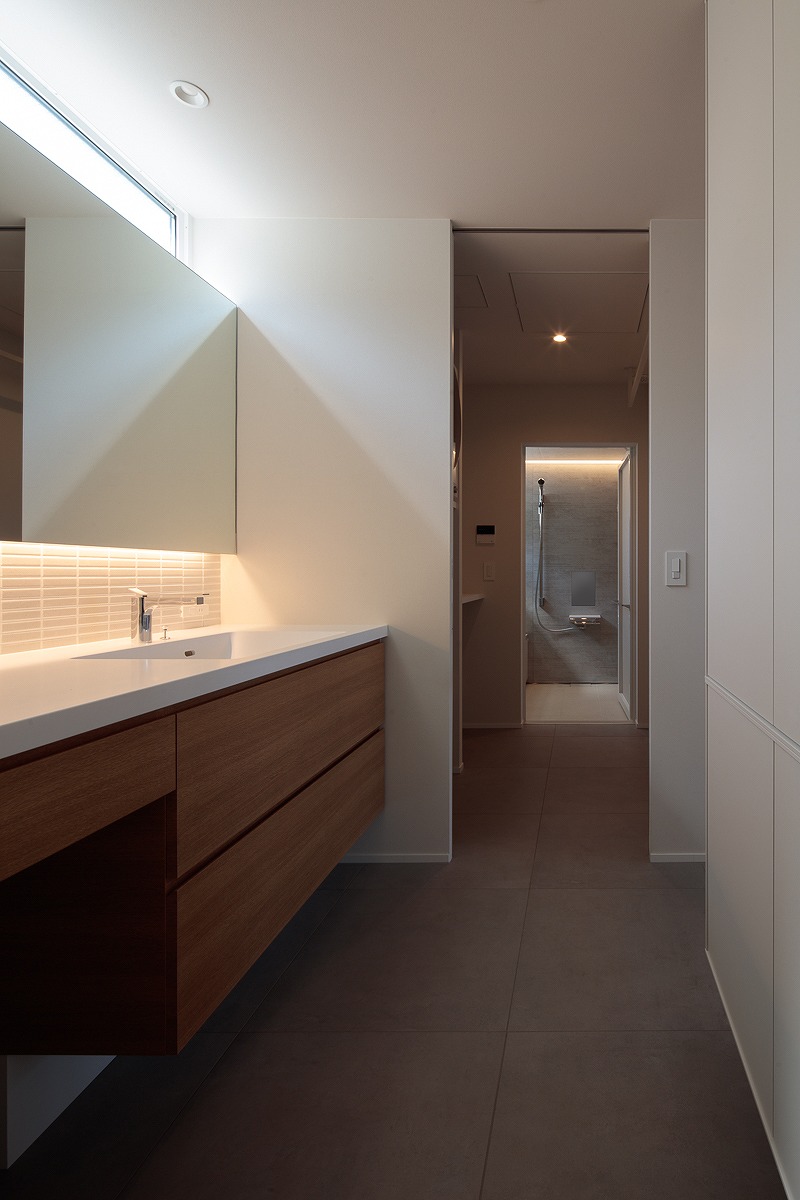 1階、2階それぞれにあるハイサイド窓は、各部屋の個別の窓というより、nLDKのプランによる分節された部屋同士を繋ぎ合わせ、この建物全体の窓として機能しています。内部に連続した風景、採光が取り込まれ、一体間が加速されます。【デザイン住宅・二世帯住宅・地下】