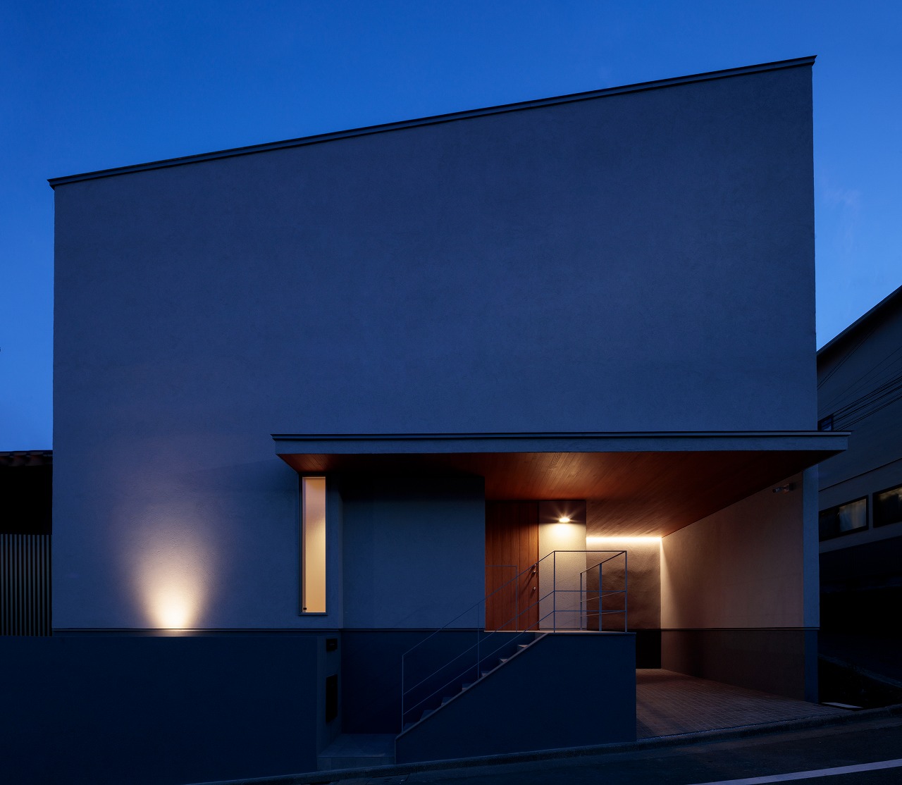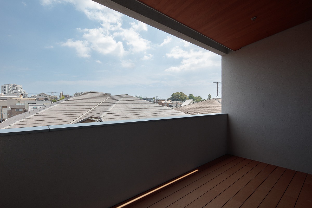 完全に隣地に囲まれた敷地の中で、建物をめいっぱい建てるための採光は、隣地の建物と建物の隙間や、隣地の庭、また、平等に存在する「空」に向かって確保する計画としています。 【デザイン住宅・旗竿敷地・賃貸併用住宅】