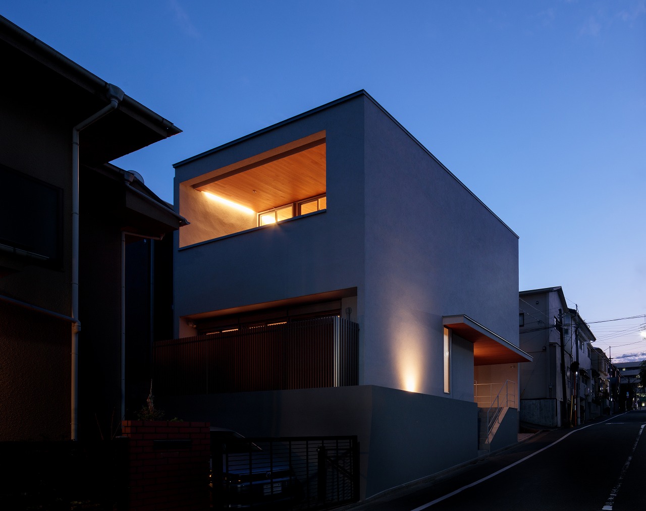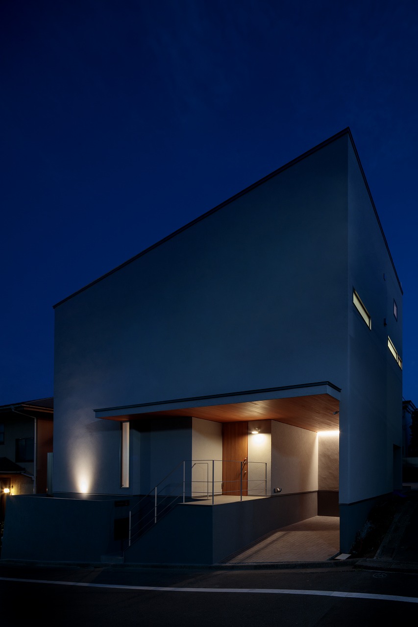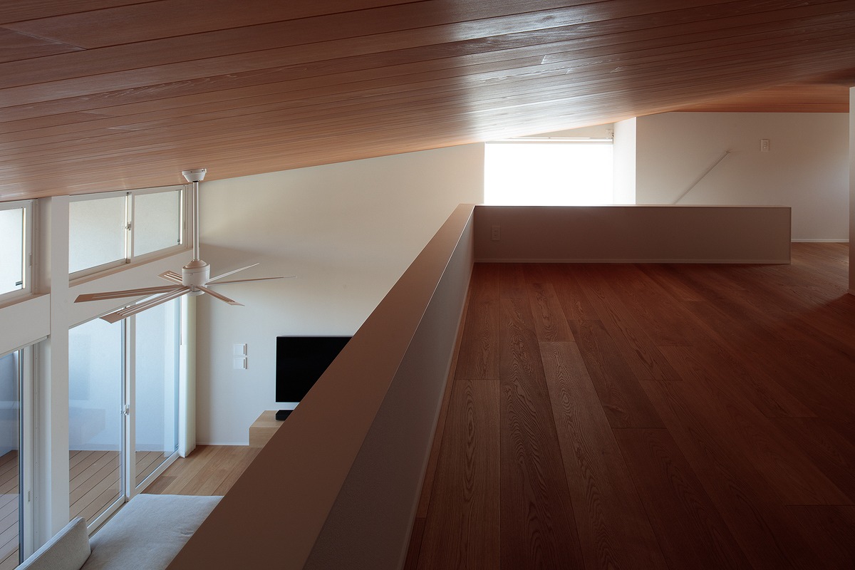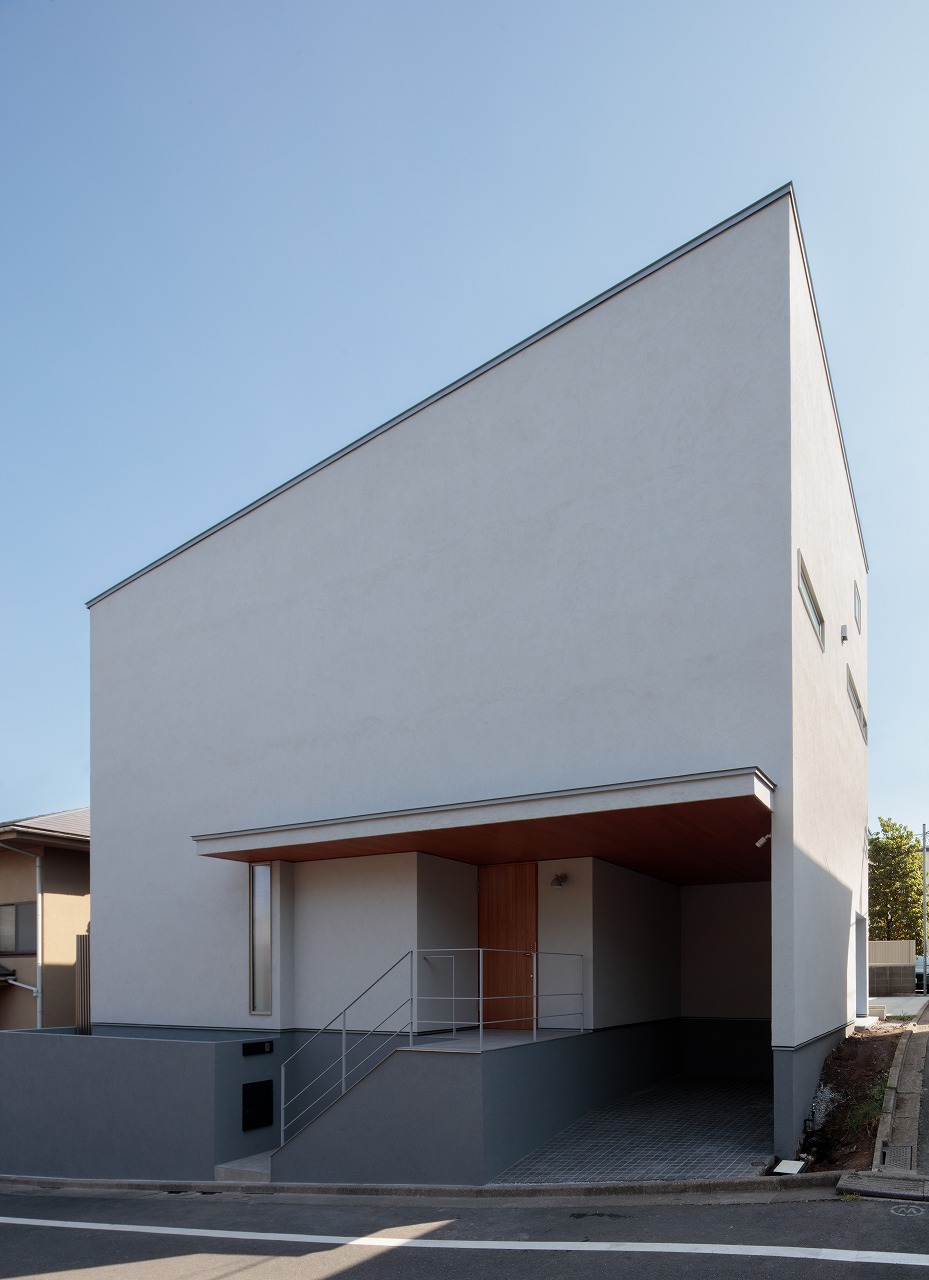 前面道路は坂になっており、道路斜線によって削られたシルエットにはならないように、2階上部のロフトは道路の高い側に配置し、道路に沿ったアウトラインとなっています。