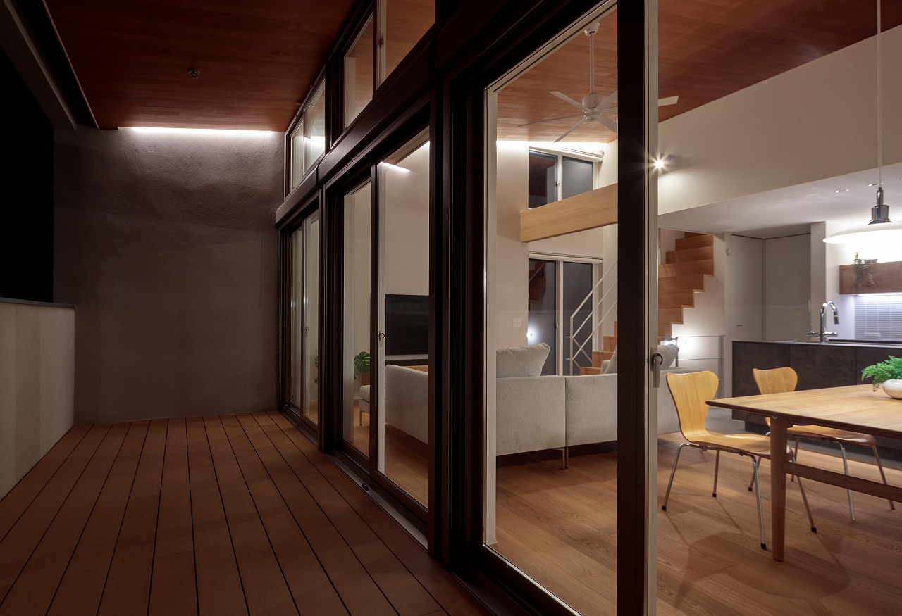 2階の隣接しないように分けたご夫婦それぞれの寝室は、この部屋のような中庭を介して、時には「続き間」のように繋がり、又は離れ、住人同士の距離をコントロールすることが出来ます。【デザイン住宅・鉄骨階段・中庭】