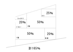 1階には玄関や各寝室(3部屋)の50%と、自動車車庫や駐輪場(3台分)の20%で計70%でつかいきり、2階は残りは高台を活かす面でLDKや、水廻りを50%で配置し、残りの20%は屋根付きのバルコニーを配置しました。さらに2階の1/2を上限とするロフトを25%で計画し、最終的には165%の床面積を確保しました。
